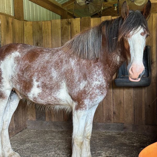 This 7-year-old Clydesdale mare stands at a graceful 17.1 hands, and she's as gentle as they come—a true "teddy bear" with a huge heart. She's currently in training and showing great promise, learning to collect, pivot, and stop off seat cues. She's a smart and willing partner, making her incredibly fun to work with.